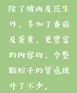 ? 成分:糯米、豬肉(臺(tái)灣)、大豆油、醬油、花生、鹹蛋黃、醬油膏[水、蔗糖、食鹽、轉(zhuǎn)化液糖(蔗糖、水)、酒精、乙醯化己二酸二澱粉、玉米糖膠、脫脂大豆(非基因改造)、小麥、焦糖色素、5'-次黃嘌呤核苷磷酸二鈉、5'-鳥嘌呤核苷磷酸二鈉、冰醋酸]、紅蔥頭、糖、香菇、蔥酥[蔥頭、棕櫚油、小麥麩皮、玉米澱粉(非基因改造)]、蝦皮、料理米酒、鹽、香菇高湯粉(L-麩酸鈉、鹽、麥芽糊精、胺基乙酸、5'-次黃嘌呤核苷磷酸二鈉、5'-鳥嘌呤核苷酸二鈉、DL-胺基丙酸、酵母抽出物、香菇抽出物、琥珀酸二鈉、關(guān)華豆膠、酵母粉 、醬油、玉米糖膠、棕櫚仁油、L-天門冬酸鈉、檸檬酸鈉、 二氧化矽、白菜抽出物 、水解大豆蛋白、香料、紅蘿蔔抽出物、糖、維生素E【抗氧化劑】)、白胡椒粉(白胡椒粒)、五香粉(肉桂、小茴香、胡荽、丁香、八角、香芹)